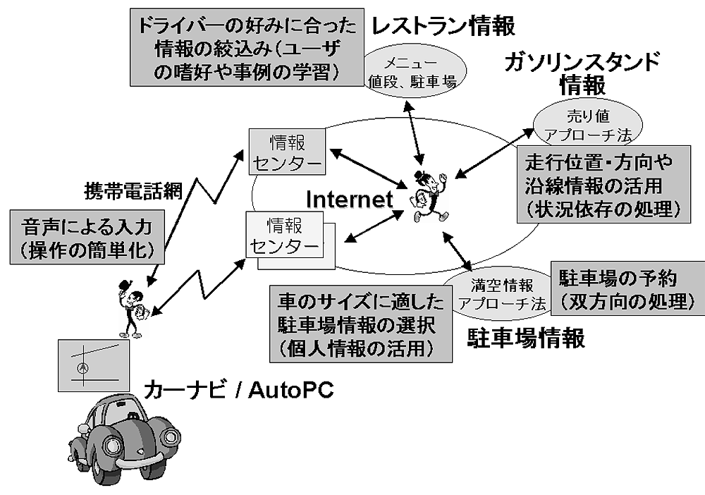 InfoMirrorでは、エージェントが自動車やドライバーの状況を把握し、状況に合ったタイムリーな情報を提供する点が特徴となる。例えば、「この近くのガソリンスタンドを知りたい」といった場合はどの道をどちら向きに走っているのかといった情報が活用され、「着いたら食事をしたい」といった要求に対しては設定された目的地近辺のレストランが評判なども考慮した上で検索される。これがさらに進歩すると、ドライバーが仕事中かレジャー中か、一人で乗っているのか、同僚と乗っているのか、もしくは家族と共にいるのかといった状況までを考慮することが可能となる。目的が異なれば、同じ目的地までの道路を案内するにしても、早く着く経路を優先するか、景色のよい経路を優先するかなど、選択基準が変わってくる。また、エージェントはドライバーの好みや自動車の特性などを把握しており、種々の判断の際にそれらの特性を活用する。例えば、先のレストラン検索において数あるレストラン情報からドライバーの好みにあった候補を絞り込む際に、過去にいかなるレストランを選択してきたかの事例が活用される。また、特定のエリアで空き駐車場を探す際などには、自動車のサイズを考慮して入庫可能な駐車場のみが候補となる。これらの特徴によりエージェントに対する指示は大幅に簡略化されるので、音声入力による指示も可能となる。自動車を運転中のドライバーが行なえる操作は制限されるので、こういったユーザインタフェースは重要である。図3.6-5にドライバー情報支援エージェントの概要を示す。