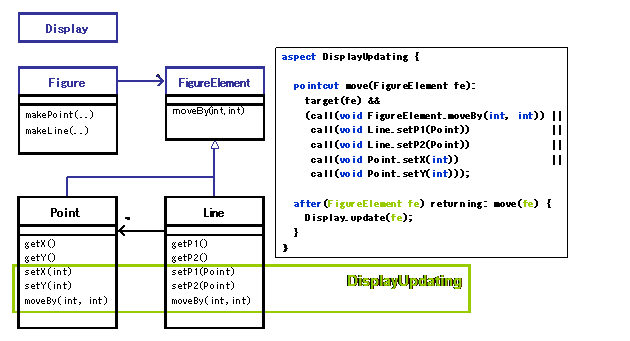 図3.5の左に示したのが、オブジェクト指向による図形描画のクラスの階層構造である。ここで、図形要素のPoint、Lineが変更されたときには、必ず画面の再描画をしなければならないが、その処理は、各図形要素すべてで記述しなければならなく、モジュラリティがよくない。アスペクト指向では、その部分を別モジュールaspect DisplayUpdatingで記述する。そこでは、pointcut文でPoint、Lineが変更されたという関心事moveを(call(FigureElement.mobeBy||Point.setX||Point.setY||Line.setP1||Line.setP2))で指定し、そのときのオブジェクトをfeと指定する。そして、関心事moveが呼び出された後処理として行うべき処理(画面の再描画)をafter文で指定している。