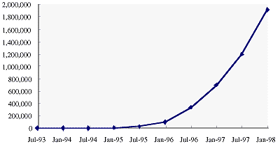 この変化は数値で見ても明らかであり、インターネットに接続するコンピュータ台数は、1994年1月に220万台であったものが、1995年1月に580万台、1996年1月に1440万台、とほぼ倍々で増加した。そして、1997年1月に2180万台、1998年1月に2970万台と1996〜1997年の伸び率は多少鈍化したものの、ここ2年は年間約800万台のコンピュータが新たにインターネットに接続され続けている[1]。