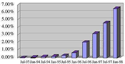 1998年2月の時点でのWWWサーバ数は、約192万台[2]であり、インターネットに接続される全コンピュータ台数に占める割合は、約6.5%である。また、図3.2-2に示すようにこの割合は年々増加しており、WWWサーバによる情報提供が、積極的に押し進められていることがわかる。