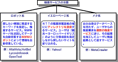 WWW情報検索サービスは、そのデータベースの構築によって図3.2-3に示すように、大きく3つに分類できる。