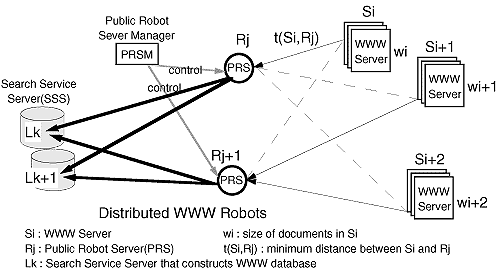 分散型WWWロボットにおいては、PRSとWWWサーバ間のデータ転送速度が、全体の収集時間を決定する大きな要因となる。このため、PRSの分担では、PRSとWWWサーバ間のサイト間距離を考慮した分散を行っている。