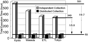 WWWロボットの分散による収集及び再配布時間の短縮を調べるために、日本国内の約半分にあたる6,980ドメインを対象に、計算により予備評価を行った結果を図3.2-5に示す。なお、分散ロボットであるPRSを東大、早大、電総研、及び京大の4個所に配置し、収集したデータを最終的に4つのSearch Service Serverに再配布すると仮定している。