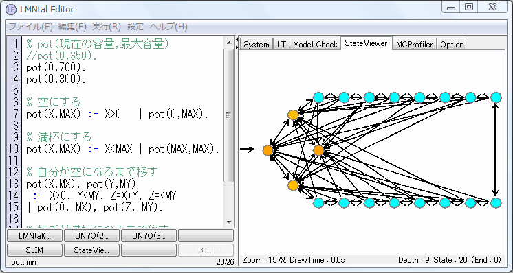 LaViT allows you to write, run, and model-check LMNtal programs with a simple user interface. In particular, State Viewer visualizes the state space of programs and offers an ideal environment for understanding the properties of programs with nondeterministic behavior.