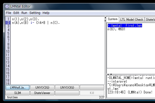 下の「LMNtal(java)」ボタンを押すと右の画面に実行結果が表示されます。