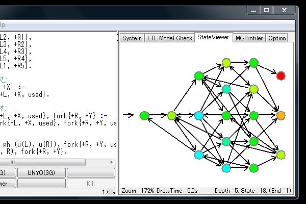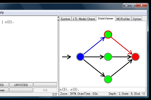 StateViewer?を起動して実行経路を表示すると、最終状態(赤い状態)が存在しプログラムが停止する可能性があることが分かります。