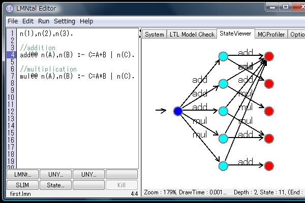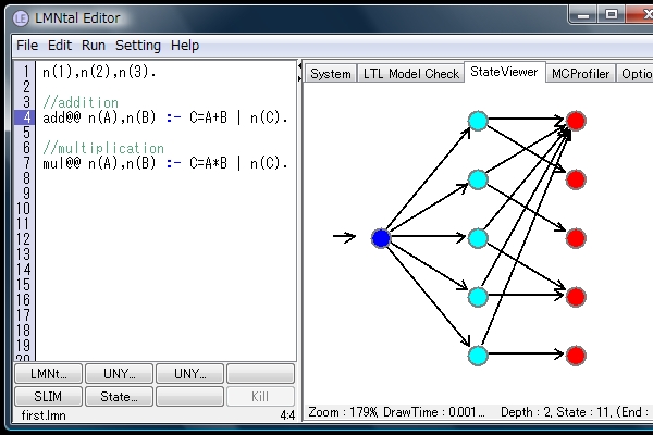 左の画面でLMNtalプログラムを書くことができます。