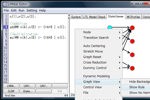 StateViewer?のウィンドウ上で右クリックし、「Graph View」⇒「Show Rule」を選択すると適用ルールの表示がされます。