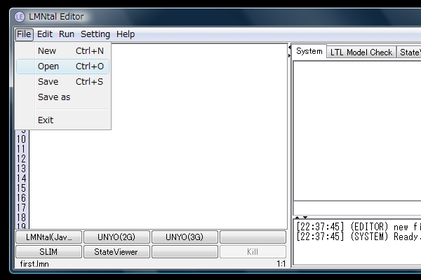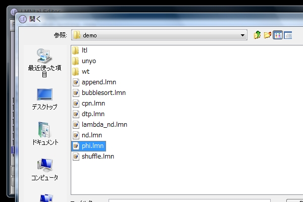 保存されている他のLMNtalプログラムを開く場合はメニューから選択します。
