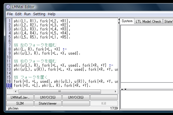 「phi.lmn」は「食事する哲学者」の問題をLMNtalでモデル化したプログラムになっています。
