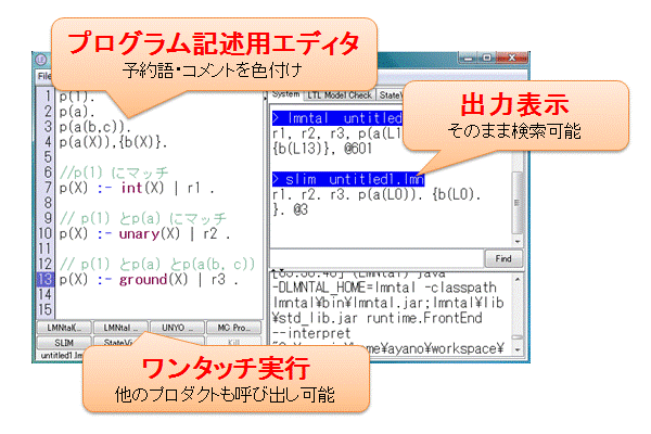 ボタンを押すとすぐにLMNtal 処理系で実行され、出力は機能部に表示されます。