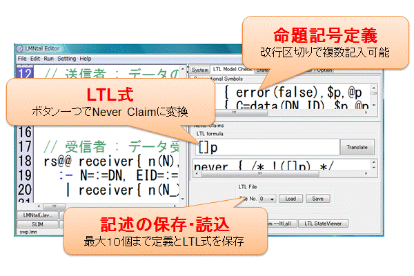 画面上からLTL2BAを呼び出すことができますのでNever Claimの記述を即座に行うことが可能です。