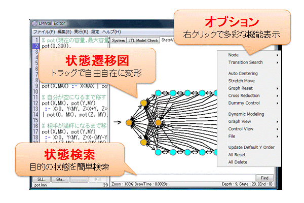 State ViewerはLMNtalプログラムの実行経路を網羅的に探索した結果を解析し可視化を行います。